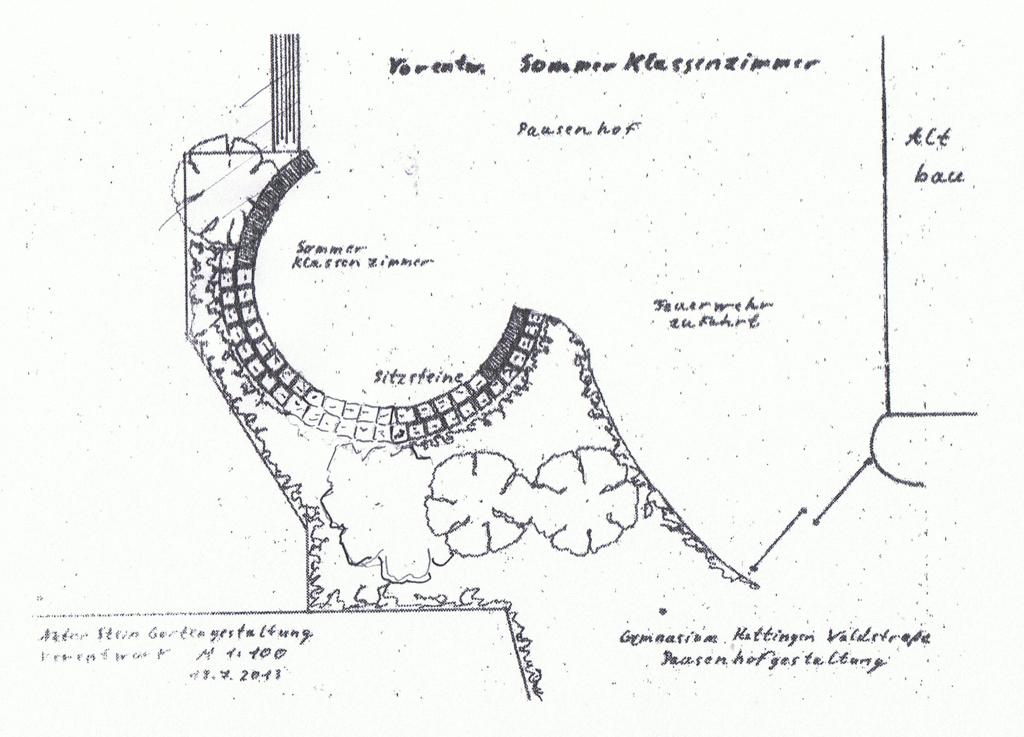 Wir haben unser Projekt "Umgestaltung des Schulhofs" bei der SpardaSpendenWahl 2013 eingereicht. Auf Wunsch vieler SuS soll (vielleicht schon zu unserem Schuljubiläum 2014) zwischen Altbau und Mensa ein „Sommerklassenzimmer“, auch outdoor classroom oder Atrium genannt (s. Entwurf), gebaut werden. Die Sparda-Bank fördert in diesem Jahr ideenreiche und Zukunft gestaltende Schulen mit Spenden bis zu 10.000 Euro und wir hoffen auf einen Bauzuschuss für unser Projekt.