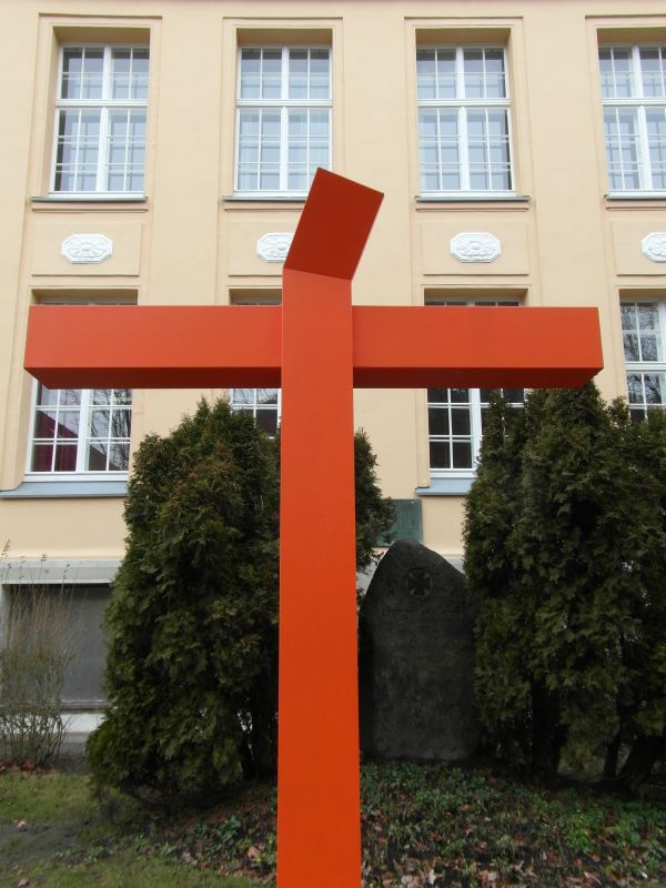 Pfarrer U. Crone holte das Kreuz für eine Woche an unser Gymnasium und platzierte es prominent vor den Altbau – und damit vor den Gedenkstein und –plakette im Andenken an die in den Weltkriegen gefallenen Lehrer und Schüler des Gymnasiums Waldstraße, die so besondere Aufmerksamkeit erfuhren.