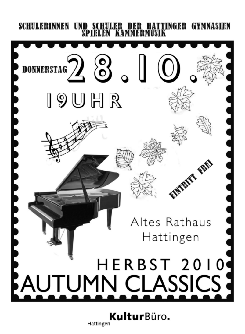 Herzliche Einladung zum diesjährigen traditionellen Kammerkonzert von Schülerinnen und Schülern beider Hattinger Gymnasien. Im letzten Jahrtausend (!) gestartet als "Musikalischer Aschermittwoch", wurde das jährliche Konzert - terminlich flexibler - als "Springtime Classics" zu einem Begriff. In diesem Jahr nun gibt es wieder etwas Neues: Aus Termingründen wanderte die Veranstaltung nun erstmals als "Autumn Classics" auf den Herbst, was aber der Qualität keinen Abbruch tut. Also: