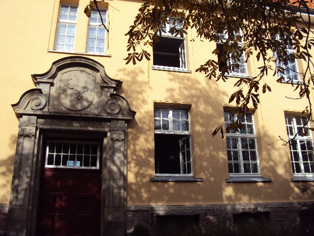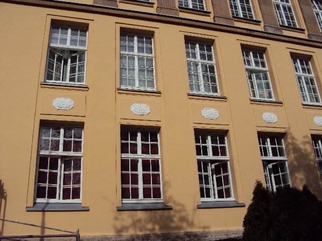 Zur Straßenseite hin erstrahlt das Gymnasium Waldstraße bereits in neuem Glanz. Die Verpackung und die Gerüste sind verschwunden. Fenster und Fassade wurden denkmalgerecht renoviert und sind nun in alter Pracht wieder sichtbar. Das beweisen auch ein paar Fotos.