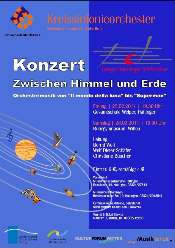 Unter dem Titel "Zwischen Himmel und Erde" tritt das rund 70-köpfige Orchester "Junge Hattinger Sinfoniker", im dritten Jahr bereits erweitert zum Jugendsinfonieorchester des Ennepe-Ruhr-Kreises, zum diesjährigen Frühjahrskonzert an.