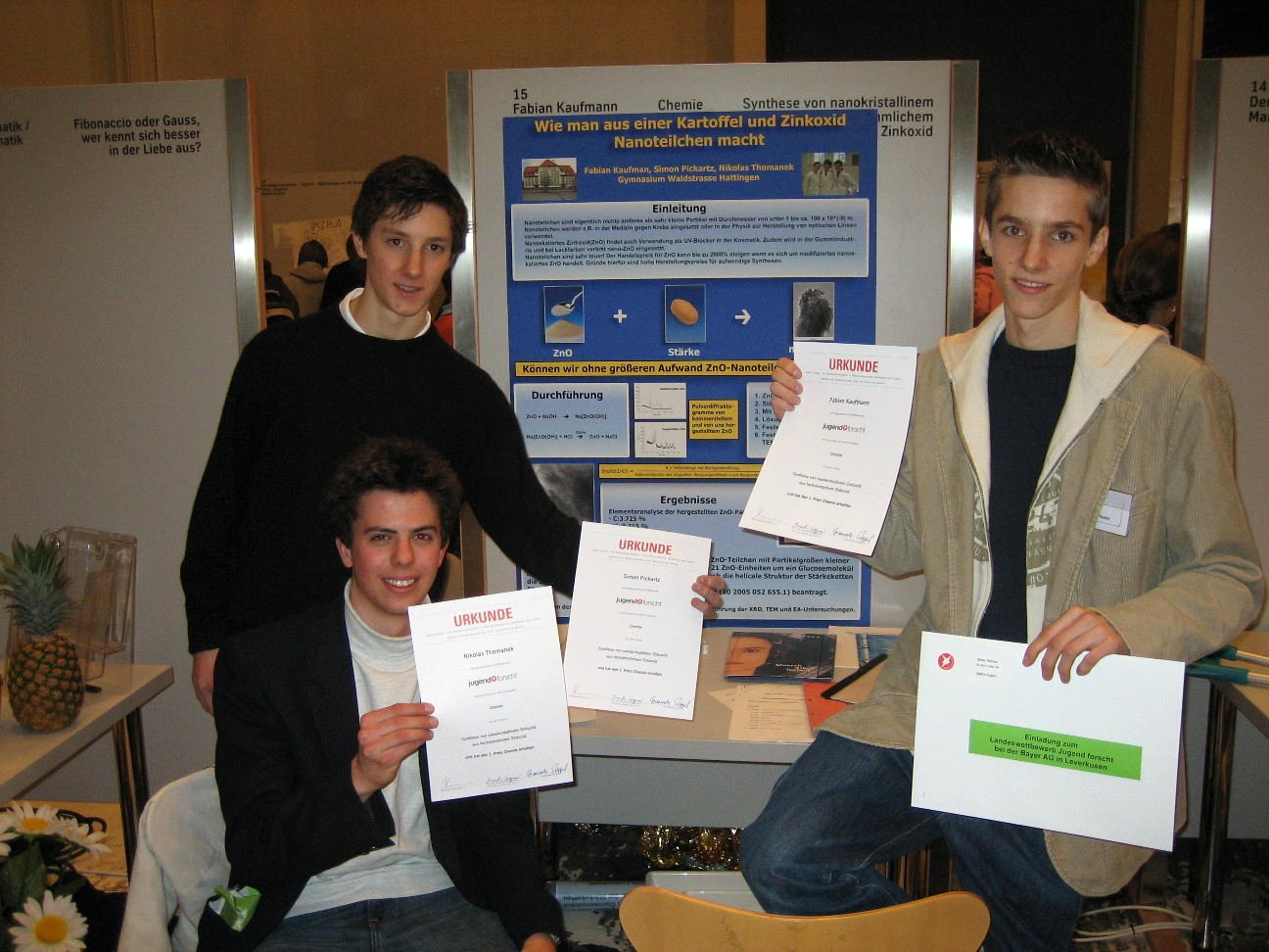 Desweiteren haben im Bereich Chemie Simon Pickartz, Fabian Kaufmann und Nikolas Thomanek aus der Jahrgangsstufe 12 für ihr Projekt den ersten Preis erhalten. Dieser berechtigt sie zur Teilnahme am Jugend-forscht-NRW-Landeswettberb in Leverkusen am 22. März 2006.![]()