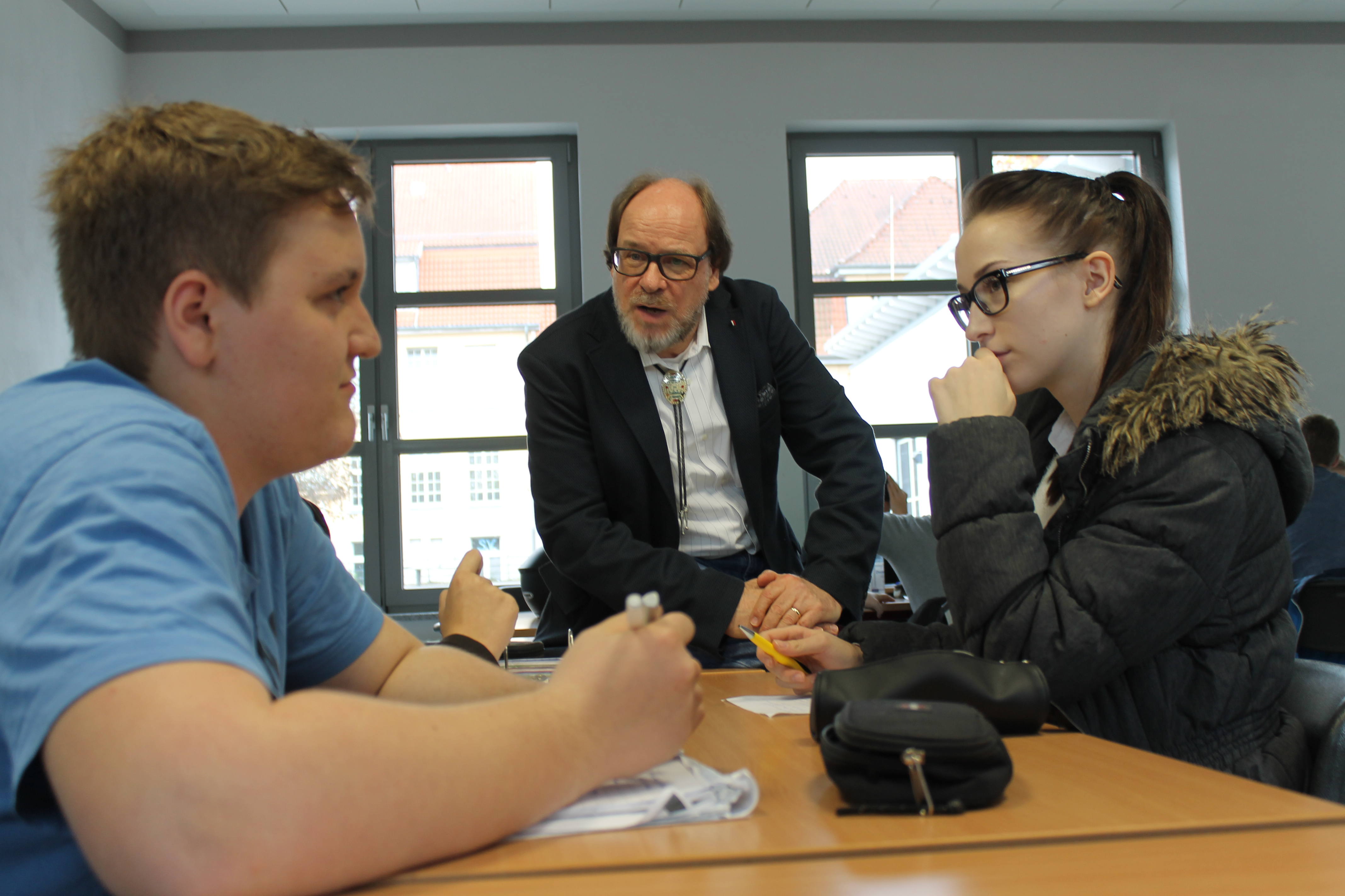 Es bleibt allerdings nicht beim Mitdenken, denn nun sind die Schülerinnen und Schüler gefordert, eigene Aphorismen zu schreiben. Unterstützt vom Autor wird an eigenen aphoristischen Texten gearbeitet, in Kleingruppen basteln die jungen Schreiber an der treffendsten Formulierung, die anschließend stolz dem Plenum präsentiert wird.